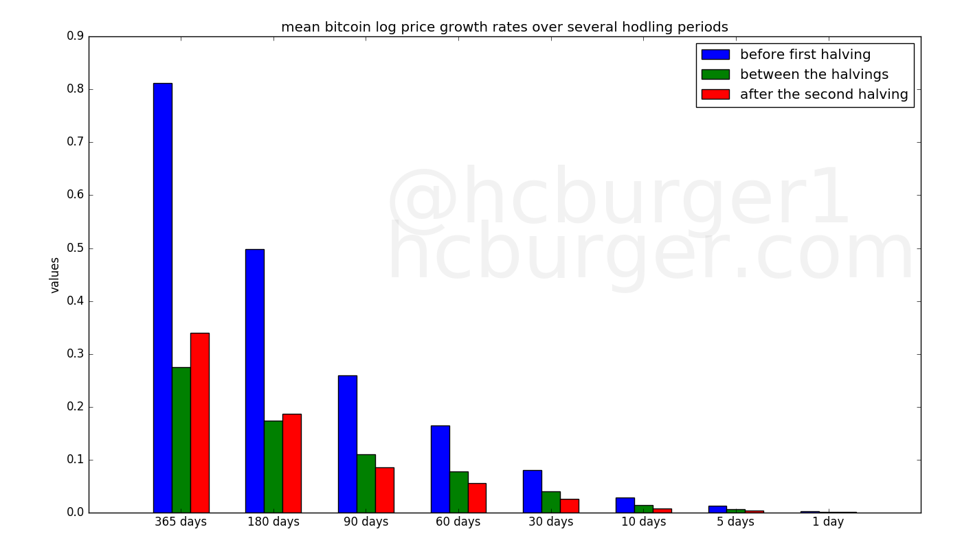The mean growth rates over most hodling periods also declines over the three halving periods. This is just a reflection of the fact that the price of bitcoin has been increasing at a slower and slower rate.