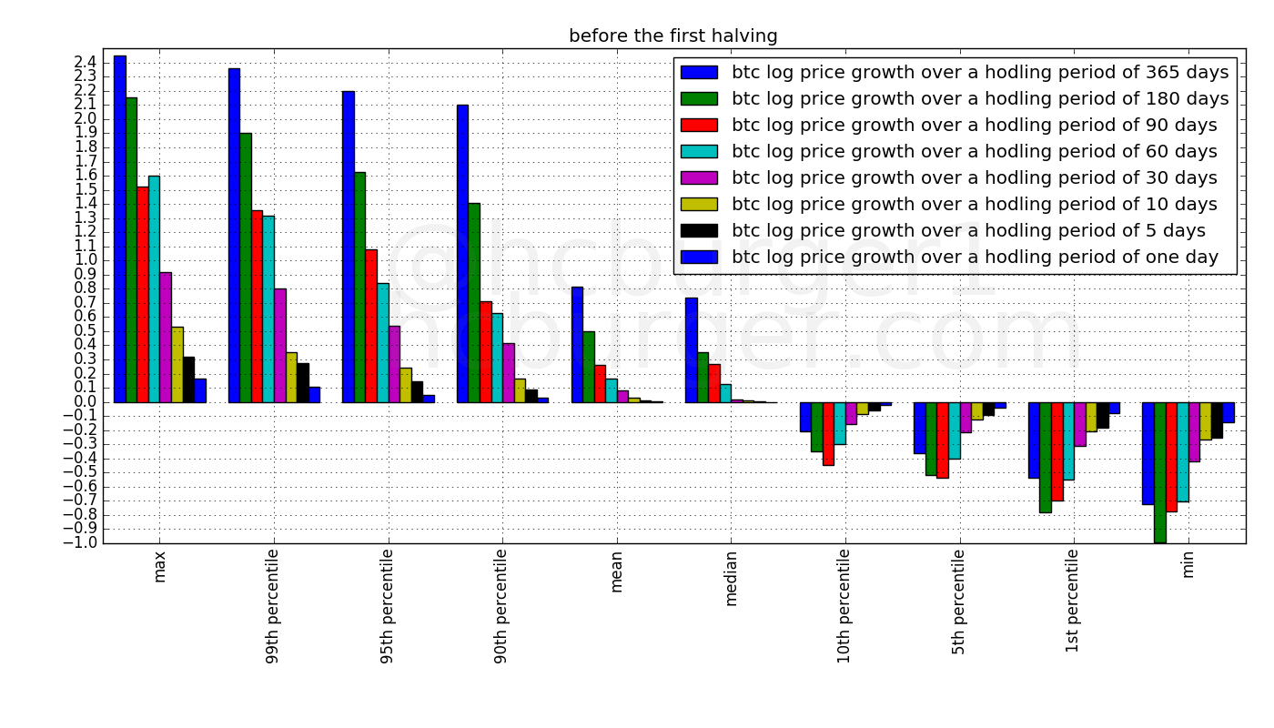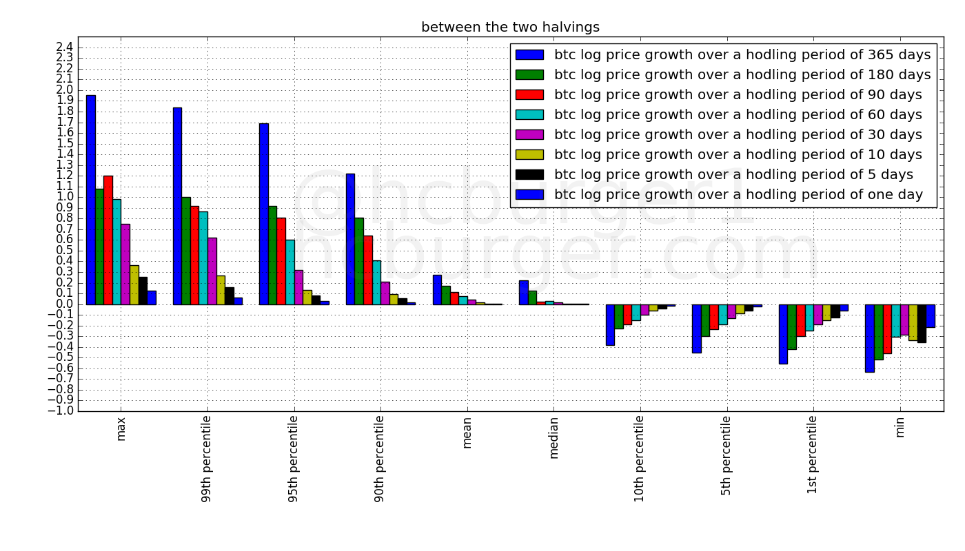 These three plots confirm that the positive growth rates over relatively short hodling periods become smaller and smaller in each succeeding halving period. To a lesser extent, negative growth rates also become smaller over time.