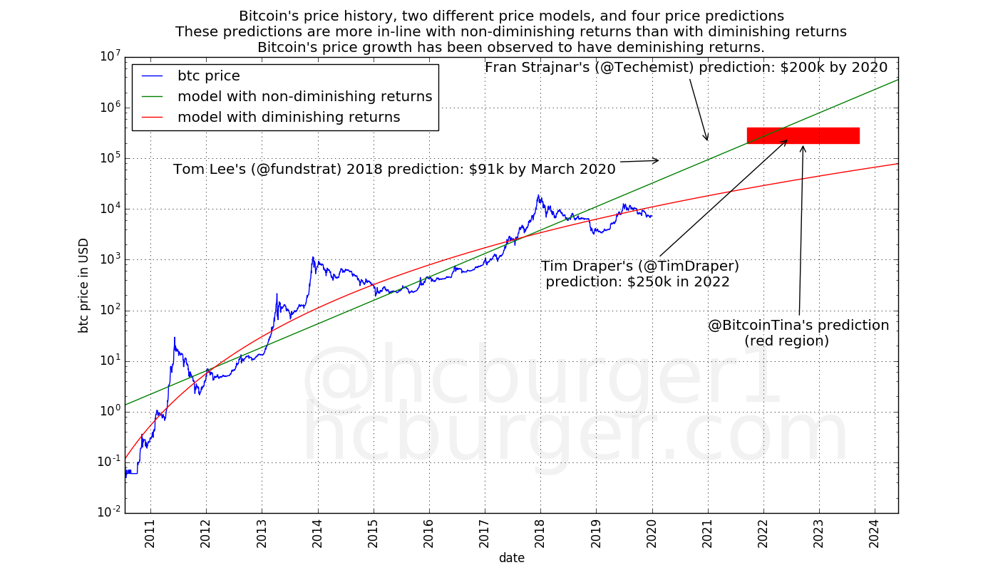 It appears that it is believed by some that bitcoin’s price will grow with non-diminishing returns, leading to some price predictions being made that are more in-line with the model with non-diminishing returns than with the model with diminishing returns: