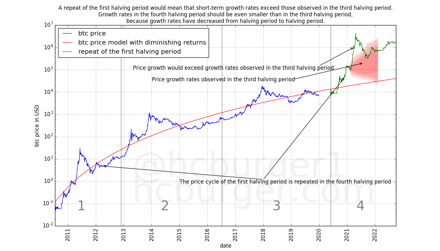 Also, it is not quite correct to say that the S2F model has non-diminishing returns: In the early history, returns as modeled by the S2F model are indeed diminishing. The returns only diminish up to a certain point, though (approximately a 10x return every 4 years).