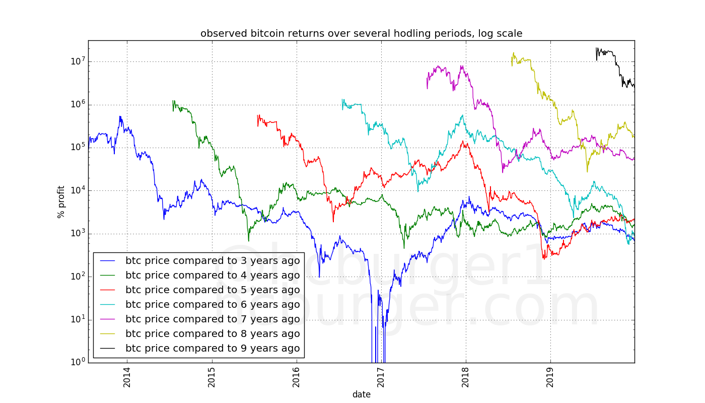 We see that according to this model, an investor who bought bitcoin and sold them 3 years later would have made a profit of approximately 2500% no matter when this investor bought his bitcoin. The same holds true for any other hodling period, but the returns are higher for longer hodling periods.