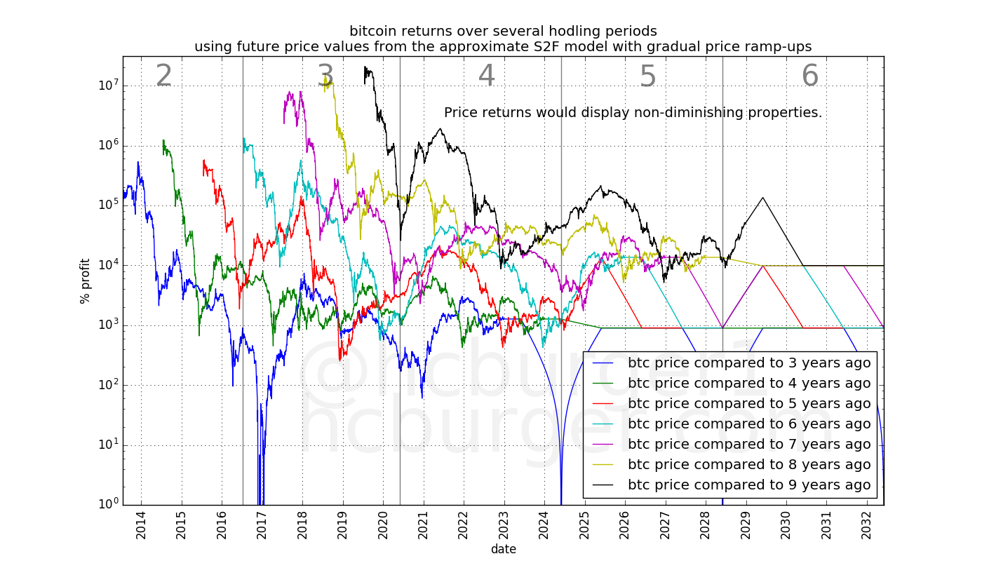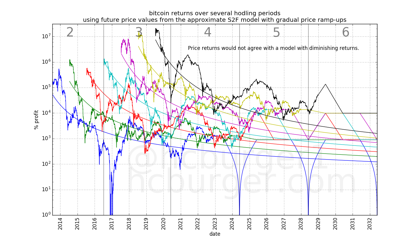 Looking at the return curves that such a price curve would generate, we see that returns at the beginning of the future halving periods (4, 5, and 6) tend to increase. Increasing returns can happen, due to volatility in the price, but should not be expected to happen systematically. We also see that returns for e.g. the three- and four-year hodling periods are more or less flat, at 1000%, reflecting the 10x price increase between halving periods predicted by the S2F model.