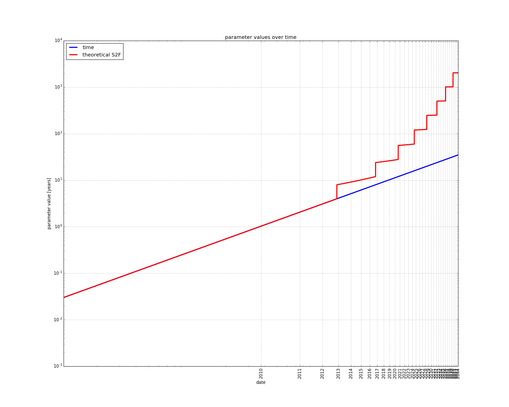 since the stock of existing coins keeps increasing, and the number of newly mined coins is divided in half every four years, the S2F measure increases, and has steep steps every four years: