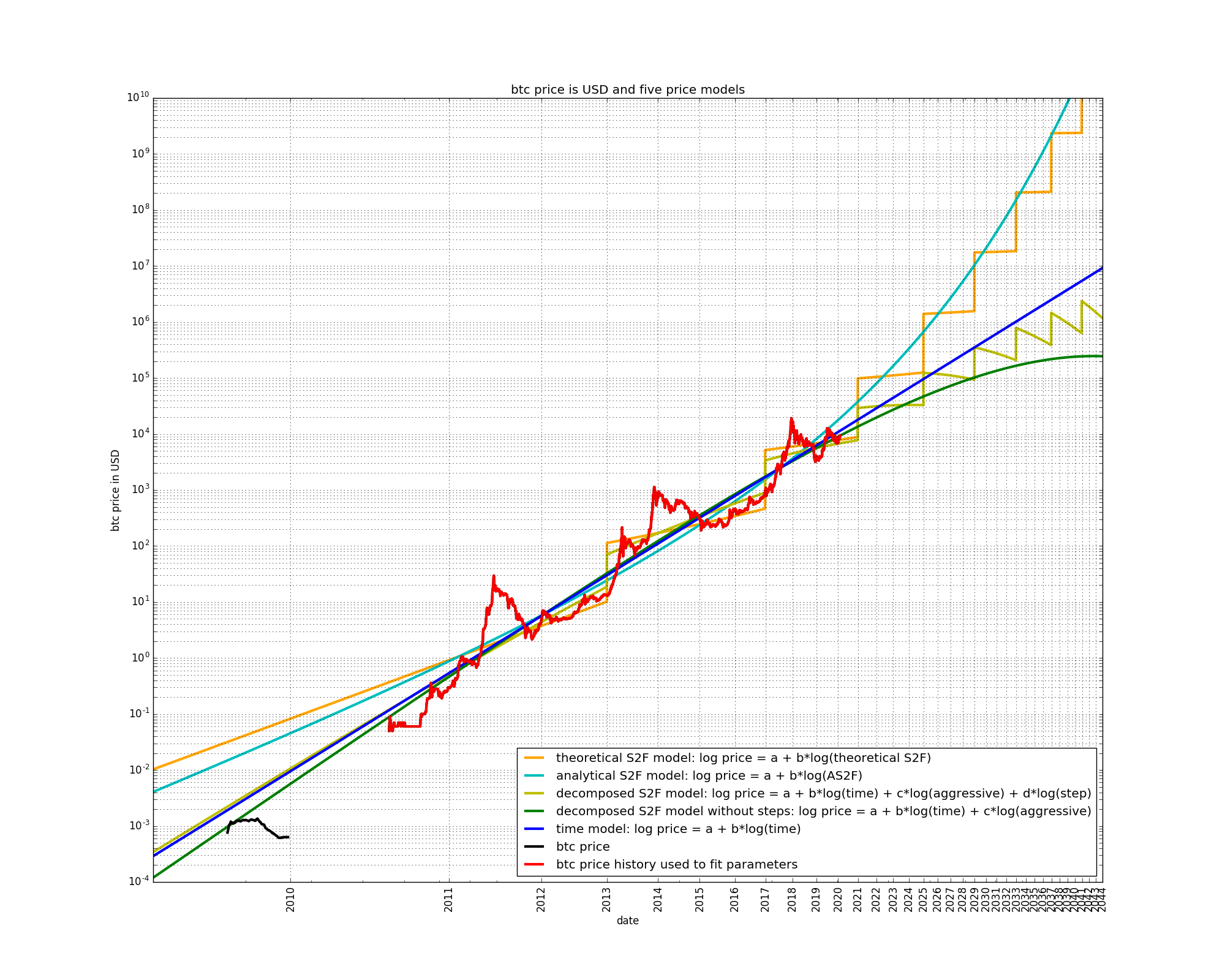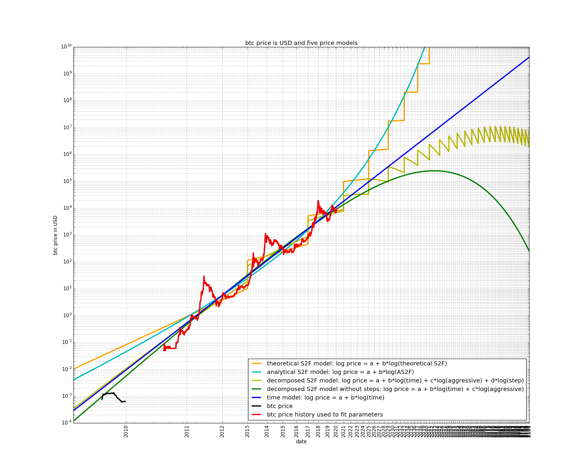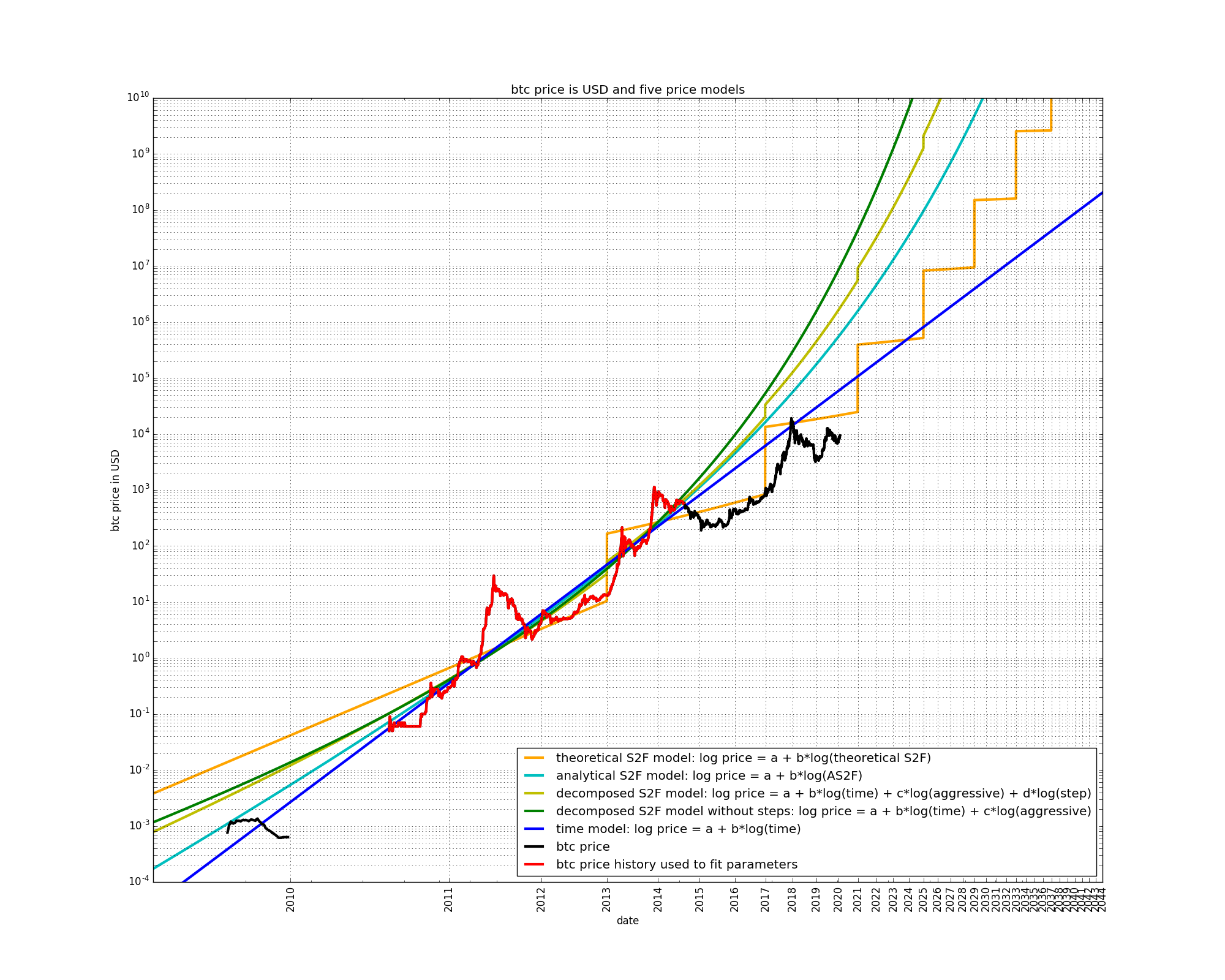 A final observation is that the early price data of 2009 is better fit by the models which have the growth which is the most diminishing, i.e. the decomposed S2F models better fit the early price data than the S2F and AS2F models.