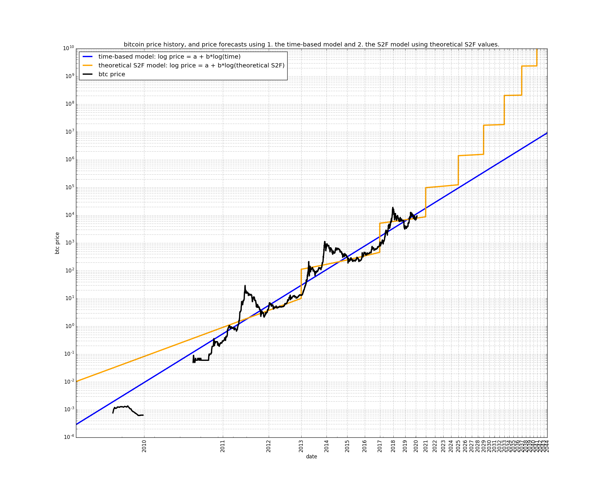The two models look superficially very similar: both predict the price of bitcoin based on the logarithm of its underlying variable. The difference in the models comes solely from the use of a different input variable. The choice of the input variable leads to wildly different price forecasts, with the stock-to-flow model producing much more bullish forecasts than the time-based model.
