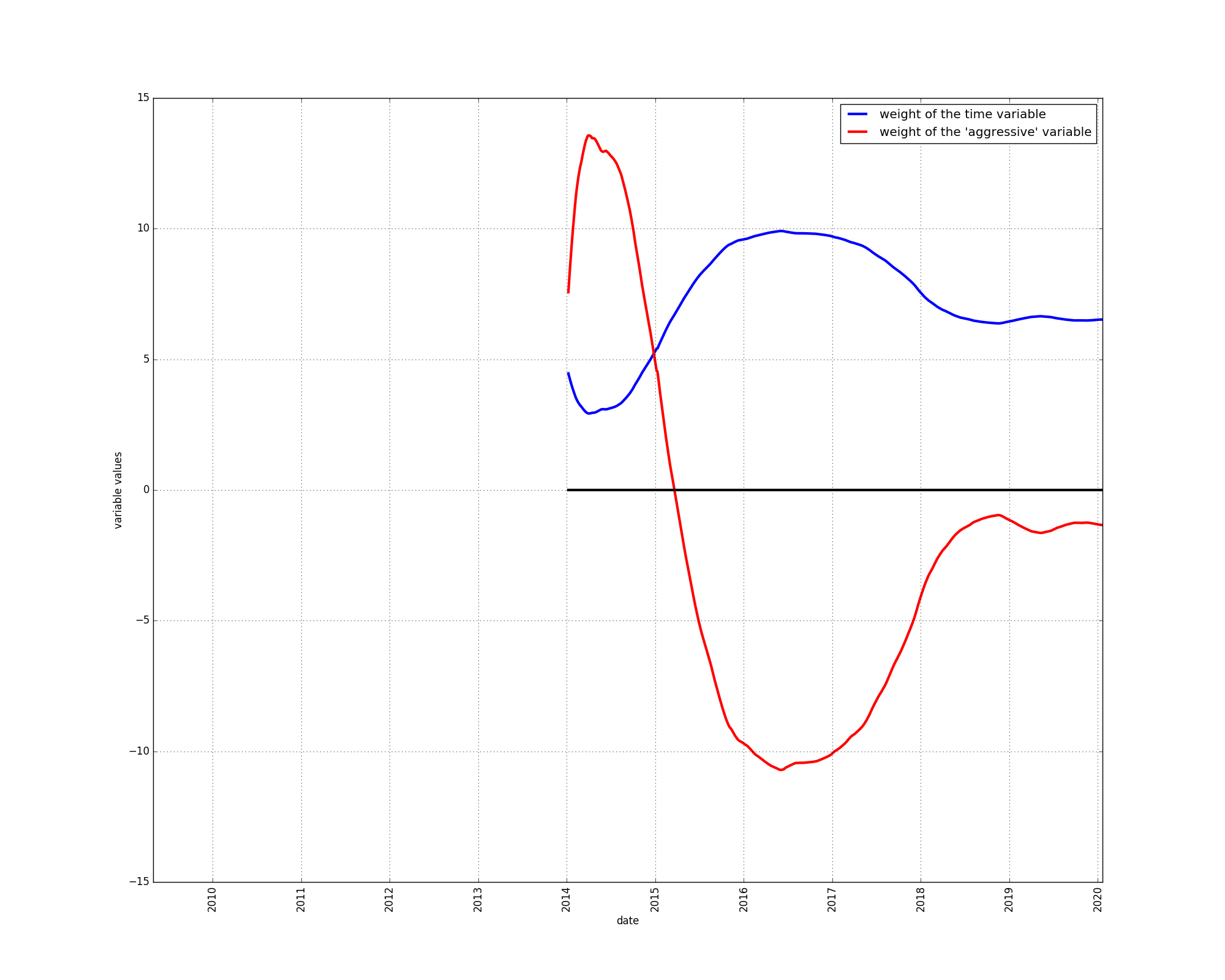 During the year 2014, the same seemed to be the case. Price growth appeared to be faster than could be explained by the diminishing returns of the time-based model, hence the “aggressive” component received a positive weighting.