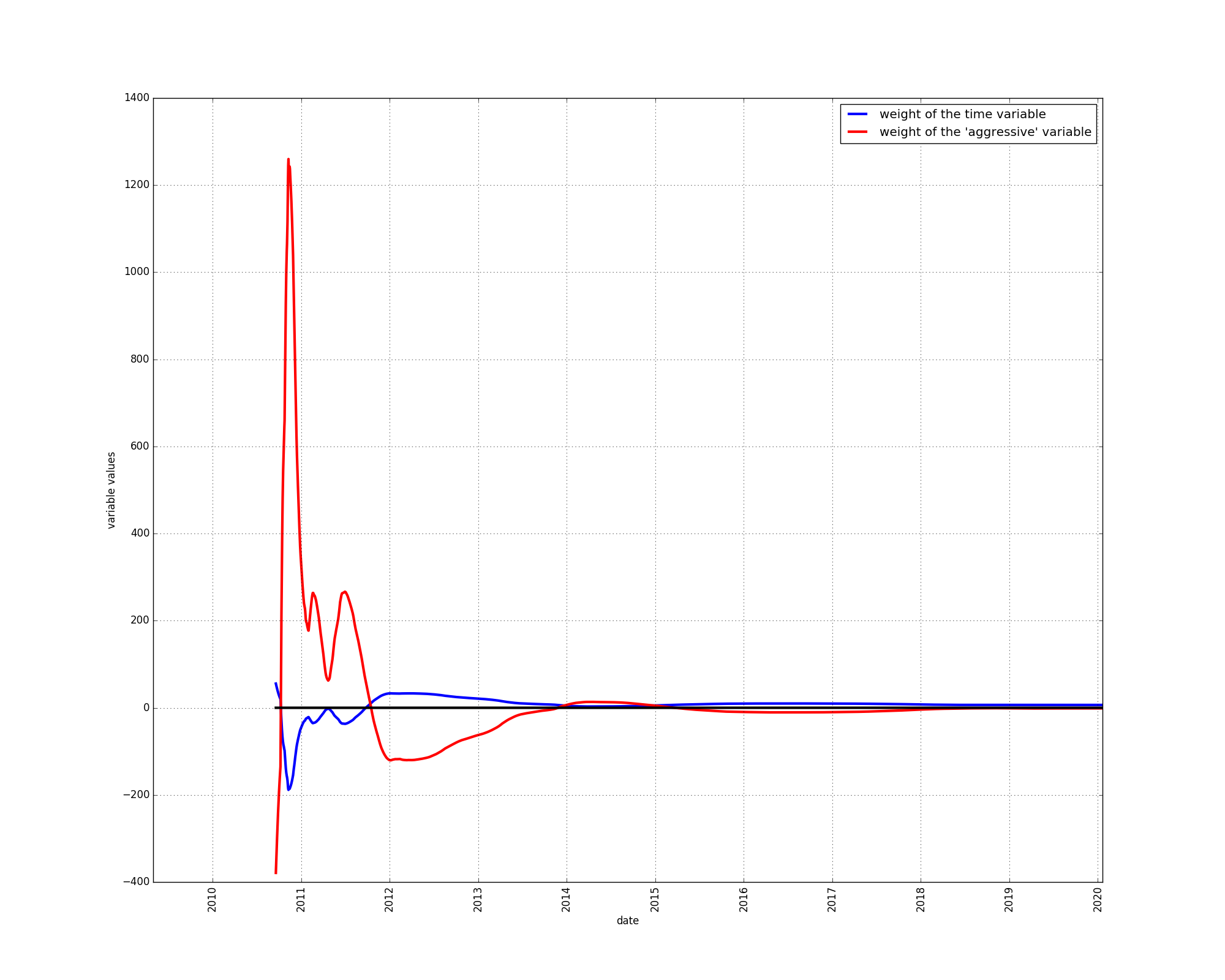 There was a period at the beginning of bitcoin’s price history, lasting from about the end of 2010 to the end of 2011 during which the price grew faster than adequately explained by the time-based model. The “aggressive” component therefore received a positive weighting.