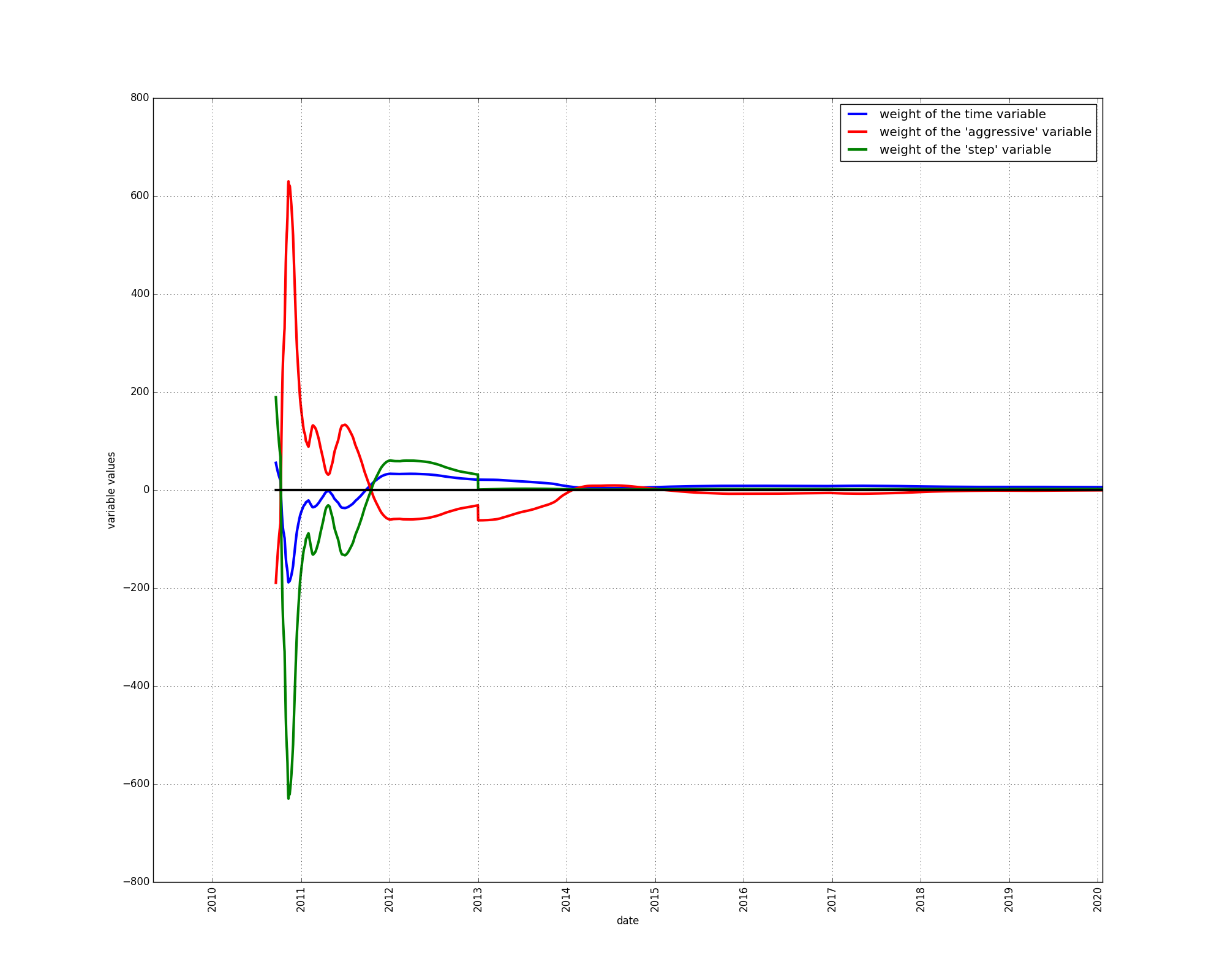 The step variable is given a positive weight starting in 2013, indicating that it is indeed useful in modelling the price. The step variable helps fit the bull markets.
